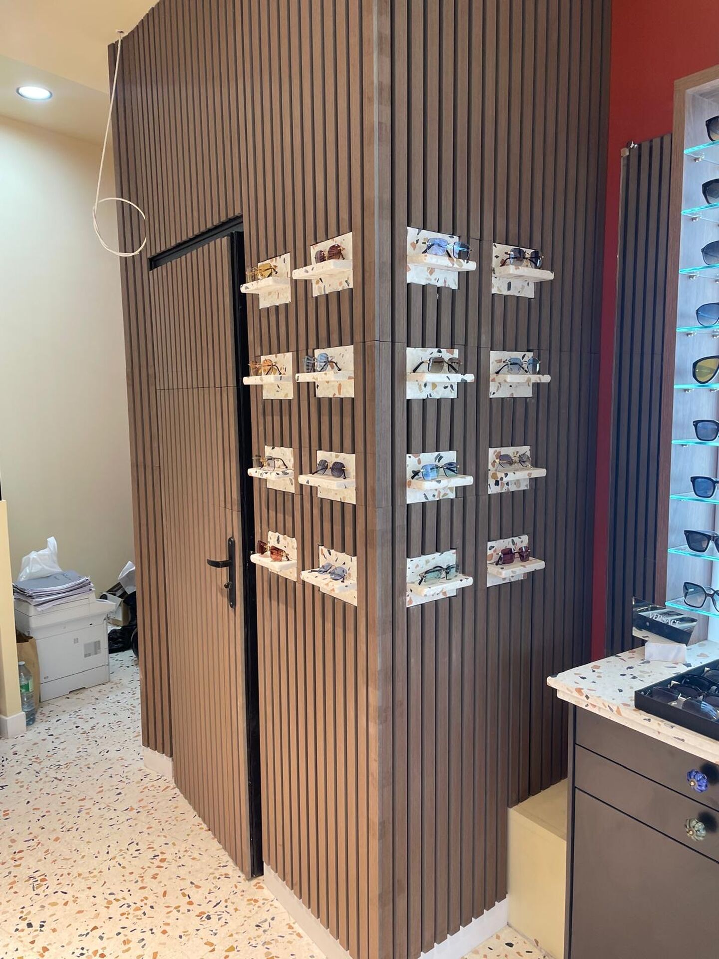 Pour Laurent Optique, nous avons conçu et réalisé un présentoir à lunettes en céramique sur mesure, pensé pour valoriser les montures tout en affirmant une identité visuelle forte et contemporaine.